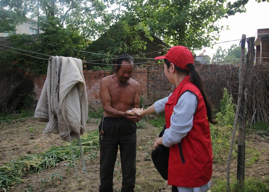 在空巢老人家里,志愿者們幫助老人們打掃衛(wèi)生,挑揀菜籽,整理床鋪,給老人梳頭、剪指甲,并陪他們聊天,講故事,與他們進(jìn)行心靈溝通。當(dāng)看到老人生活困難時(shí),志愿者深受打動(dòng),把隨身攜帶的餅干和飲料等食品送給困難老人。有位老大爺接到食品后激動(dòng)地含著淚水說:“你們來這里給我打掃衛(wèi)生、疊被子、拉家常,我很高興,謝謝你們”?吹嚼先藗兡樕涎笠绲臓N爛笑容,志愿者們也會(huì)心地笑了 。