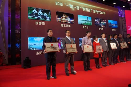 2015年12月25日至26日,由中國(guó)旅游協(xié)會(huì)、中國(guó)旅游報(bào)社共同主辦的第五屆中國(guó)旅游產(chǎn)業(yè)發(fā)展年會(huì)暨首屆中國(guó)(國(guó)際)冰雪旅游峰會(huì)在黑龍江省哈爾濱市舉行。26日下午舉行了2015中國(guó)旅游風(fēng)云榜頒獎(jiǎng)儀式,洛陽(yáng)市榮獲“2015‘一帶一路’旅游推廣城市TOP10”(其他九個(gè)獲獎(jiǎng)城市分別是成都、西安、蘇州、哈爾濱、西寧、伊寧、舟山、泉州、梅州),洛陽(yáng)市旅游發(fā)展委員會(huì)主任王曉輝代表洛陽(yáng)市領(lǐng)取獎(jiǎng)項(xiàng),并代表十個(gè)獲獎(jiǎng)城市發(fā)表獲獎(jiǎng)感言,推介洛陽(yáng)旅游,介紹洛陽(yáng)作為“世界圣城、絲路起點(diǎn)、千年帝都、牡丹花城”城市旅游形象和品牌,同時(shí)盛情邀請(qǐng)與會(huì)領(lǐng)導(dǎo)、嘉賓、旅游業(yè)界同仁和新聞媒體蒞臨洛陽(yáng)觀賞國(guó)色牡丹,感受古都風(fēng)情。
