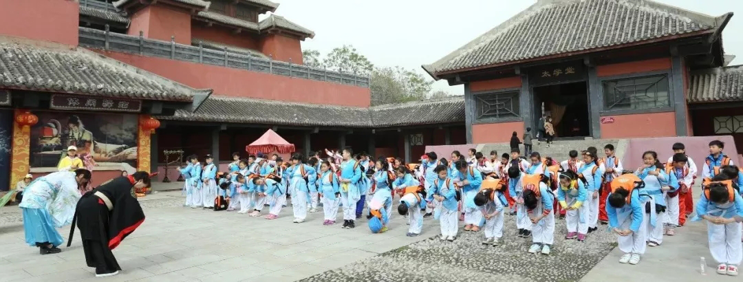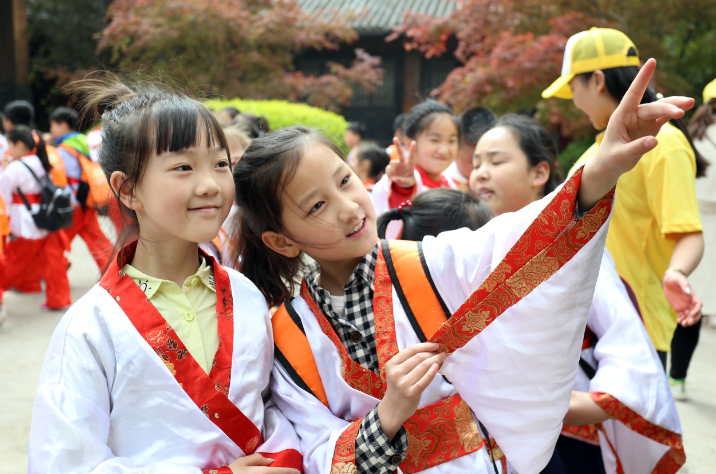 在工作人員的帶領(lǐng)下,百名兒童身穿漢服一起誦讀儒家經(jīng)典,學(xué)習(xí)古代禮儀,伴隨著古樂吟唱經(jīng)典,稚氣而爽朗的朗讀聲回響在影視城的上空。家長們也紛紛帶上自己的孩子,到現(xiàn)場共同參與國學(xué)經(jīng)典誦讀,共同感受中華民族的孝親文化,接受中華文化經(jīng)典的熏陶。