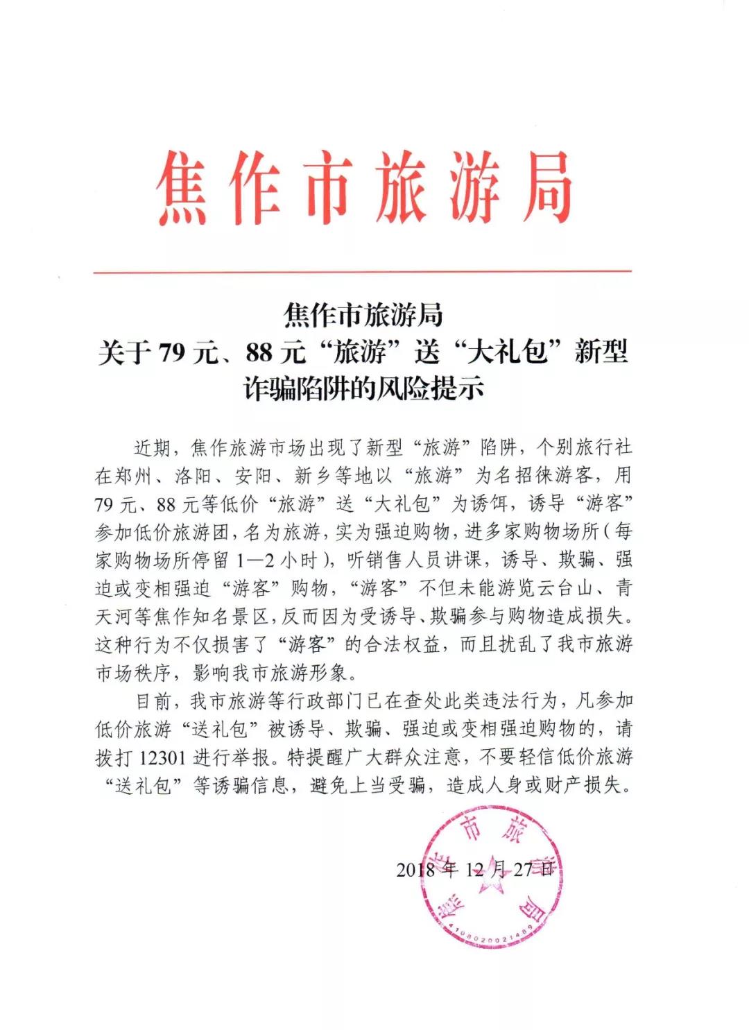 焦作市旅游局關(guān)于79元、88元“旅游”送“大禮包”新型詐騙陷阱的風(fēng)險提示