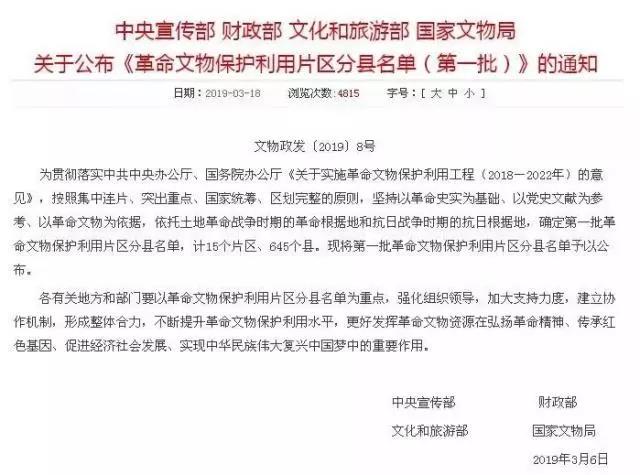 中宣部等四部門確定的首批革命文物保護利用片區(qū)分縣名單共計15個片區(qū),分別是井岡山片區(qū)、原中央蘇區(qū)片區(qū)、湘鄂西片區(qū)、海陸豐片區(qū)、鄂豫皖片區(qū)、瓊崖片區(qū)、閩浙贛片區(qū)、湘鄂贛片區(qū)、湘贛片區(qū)、左右江片區(qū)、川陜片區(qū)、陜甘片區(qū)、湘鄂川黔片區(qū)、晉冀豫片區(qū)和蘇北片區(qū),涉及20個。ㄖ陛犑校、110個市、645個縣。其中,晉冀豫片區(qū)包括山西、河北、河南三省的99個縣(市)區(qū),涉及焦作市的有9個縣(市)區(qū),分別是解放區(qū)、中站區(qū)、馬村區(qū)、山陽區(qū)、修武縣、博愛縣、武陟縣、溫縣和沁陽市。
