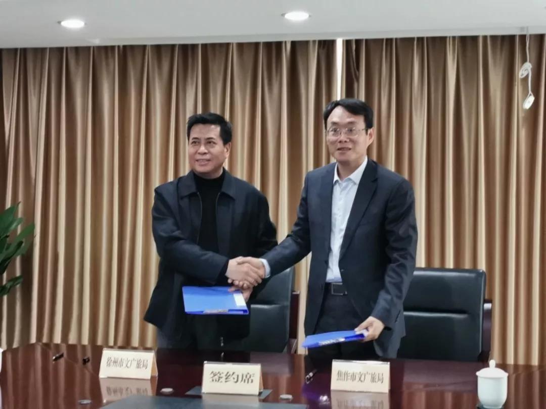 焦作市文化廣電和旅游局局長(zhǎng)金貴斌和徐州市文化廣電和旅游局局長(zhǎng)崔鋒簽署兩地文旅合作協(xié)議。