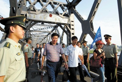 中國赴朝游客正徒步穿越遼寧丹東與朝鮮接壤的“中朝友誼橋”(攝于2007年8月15日)