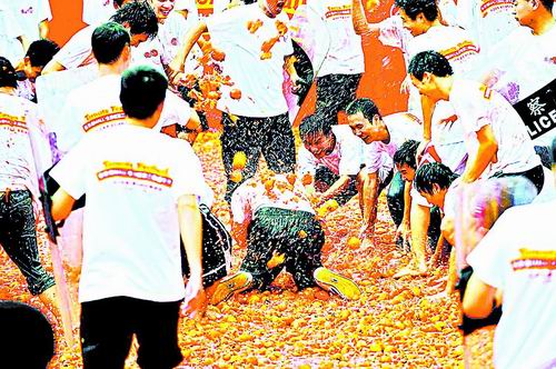 昨日,東莞新華南MALL·生活城人山人海,第二屆番茄節(jié)在這里舉行,數(shù)百人組成兩隊進(jìn)行番茄大戰(zhàn),大戰(zhàn)共消耗了15噸新鮮番茄。廣日供圖