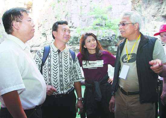 昨日上午,聯(lián)合國(guó)教科文組織專家組在觀看云臺(tái)山世界地質(zhì)公園科普教育片、聽(tīng)取云臺(tái)山世界地質(zhì)公園建設(shè)與管理情況的匯報(bào)后,分別就其五個(gè)園區(qū)的整體性、游客容載量、環(huán)境保護(hù)及科普教育培訓(xùn)等方面提出了問(wèn)題,焦作市所作的解答令專家滿意。隨后,專家組成員饒有興致地參觀了有“萬(wàn)里黃河第一觀”之稱的武陟縣嘉應(yīng)觀。下午,專家組成員又來(lái)到云臺(tái)山園區(qū)考察,雖然途中遇到了大雨和冰雹,但進(jìn)入園區(qū)后,天空逐漸放晴,陶醉于紅石峽美景的三位外國(guó)專家不時(shí)地停下來(lái)拍照留念。