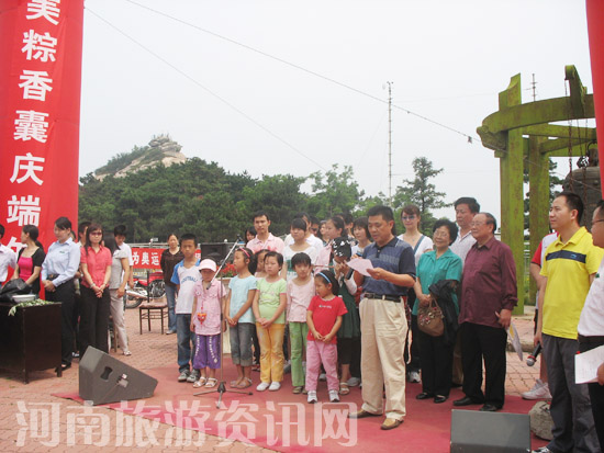 五月端午雄黃酒,桃枝艾葉門頭掛,佩戴香囊送祝福,歡度佳節(jié)雞公山。6月8日,來自四川災區(qū)、《快樂星球》劇組的小朋友們,鄭州抗災一線的工作者、信陽籍多名藝術家以及省會多名媒體記者歡聚雞公山,參加“美粽香囊慶端午,鳴鐘祈福迎奧運”雞公山端午節(jié)活動,共同慶祝節(jié)日。