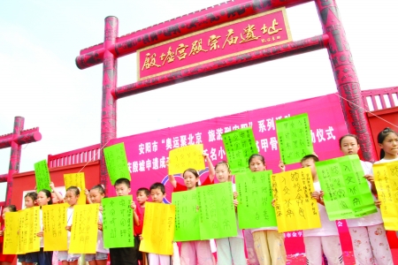 昨日是安陽的世界文化遺產(chǎn)日,一大早,殷墟宮殿宗廟遺址前上演的大氣磅礴的《大秀殷商》,更給各地的游客獻(xiàn)上了一份特殊的節(jié)日禮物。“太震撼了,殷墟給了我很大的驚喜!”陪孩子從青島來殷墟參觀的林輝,看完節(jié)目后備感驚喜的表示。而隨后進(jìn)行的“迎奧運(yùn)慶申遺千名小學(xué)生同寫甲骨文活動(dòng)”,更讓林輝等客人開了眼界。來自安陽市各小學(xué)的千名學(xué)生代表,在殷墟門前席地而坐,用他們稚嫩的小手,書寫著中國古老的甲骨文字。“安陽既有地理優(yōu)勢,又有特殊的文化旅游資源,我相信通過安陽人民勤勞的雙手一定會(huì)將她建設(shè)得更加美麗。”林輝贊嘆道。