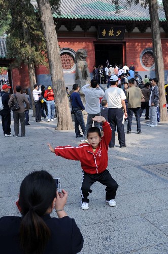10月19日,在河南嵩山少林寺門前,一位小朋友在留影。 記者在河南一些著名旅游景點看到,雖然黃金周已過,但這些景點依然游人如織。據了解,很多游客專門避開黃金周利用休息日游玩。 劉海峰/攝