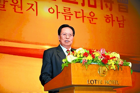 徐光春在講話中首先代表近億河南人民向出席說明會(huì)的各位來賓表示熱烈的歡迎和衷心的感謝。徐光春說,中韓建交16年來,兩國(guó)在政治、經(jīng)濟(jì)、文化等各方面的合作取得了很大成績(jī)。韓國(guó)是河南主要的貿(mào)易合作伙伴,也是河南最大的外商投資來源地之一,隨著兩地交流的日益深入,大量韓國(guó)游客來到河南旅游觀光,僅去年一年河南就接待韓國(guó)游客7萬人次。