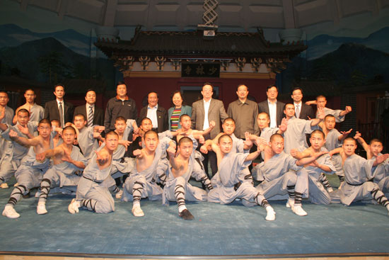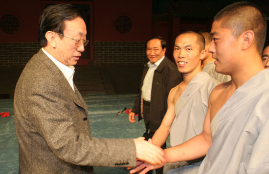 在武術(shù)館演武廳,武術(shù)館弟子向領(lǐng)導(dǎo)們展示了少林童子功、硬氣功、八段錦等少林傳統(tǒng)功夫,這也是每天為游客演出的常規(guī)項(xiàng)目,弟子們扎實(shí)的基本功贏得了領(lǐng)導(dǎo)們的陣陣掌聲。演出結(jié)束后,郭庚茂走上舞臺與弟子們一一握手,并合影留念。