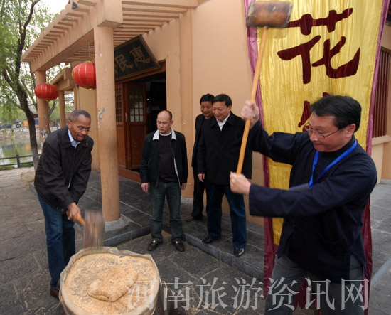 下午,參觀團來到開封清明上河園,受到開封市民的熱情歡迎。包公迎賓、古裝演出、雕廊畫柱、宋風(fēng)古韻,市長們恍然間仿佛置身于數(shù)百年前繁華昌盛的大宋帝國,在回廊里徜徉,在瓦肆間欣賞,癡迷于建筑設(shè)計的奇妙,驚嘆于民間藝人的精巧。他們津津有味地欣賞著踩高蹺、吹糖人、繡球招親、民間墜子等宋代民俗節(jié)目,還饒有興趣地掄起木槌,認(rèn)認(rèn)真真地做起了開封名吃花生糕。當(dāng)他們看到民間絕技“口噴火焰”時,大呼過癮,紛紛拿起相機,拍照留念。晚上,大型實景演出《大宋•東京夢華》更是將一副副恢宏絢麗、如夢如幻的精彩畫卷史詩般展現(xiàn)在嘉賓們面前,古都開封的歷史脈搏,厚重河南的文化魅力,深深地震撼了在場的每位嘉賓。