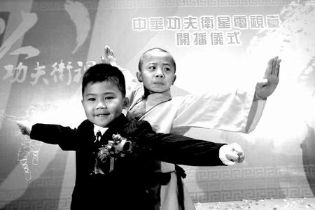 兩個小朋友的表演吸引了眾人的目光。8歲半的少林武術(shù)團成員劉洪濤在臺上舞槍弄棒、龍騰虎躍,身著西服、年僅4歲半的孫天奇在臺下比劃模仿。團體表演結(jié)束后,孫天奇跳到臺上與劉洪濤“過招兒”,擺得架子真像那么回事(如上圖)。“我在幼兒園就愛學(xué)中國功夫,以后我要跟著電視學(xué)!”孫天奇說。