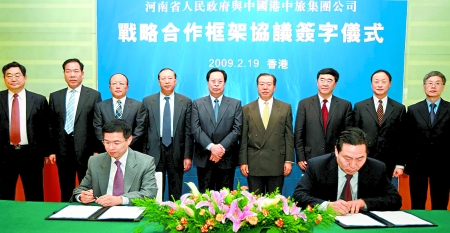 2月19日上午,我省與中國港中旅集團公司簽署戰(zhàn)略合作協(xié)議,共同開發(fā)河南豐富的旅游資源,共謀發(fā)展,共建雙贏。省委書記、省人大常委會主任徐光春,省委常委、省委秘書長曹維新,副省長史濟春,港中旅集團公司董事長張學武等出席簽字儀式。