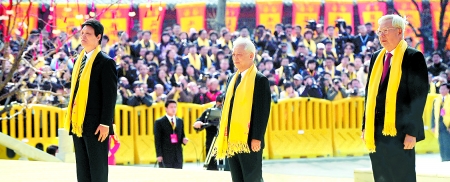 嘉賓經(jīng)環(huán)島進(jìn)入炎黃廣場(chǎng)駐足觀看,800名表演者為嘉賓們展示了雄渾剛勁的少林拳法、刀術(shù)、劍術(shù)等,精彩的表演贏得嘉賓們的熱烈掌聲和嘖嘖稱贊。隨后,嘉賓們通過(guò)昌運(yùn)樓,登上鼎壇,通過(guò)臥碑,經(jīng)神道至漢闕。中華姓氏廣場(chǎng)上百家姓旗陣飄飄,恰似一片紅色的海洋。嘉賓們緩步行至漢闕前,禮儀小姐捧盥洗盆、柳條為周鐵農(nóng)、陳宗興、羅豪才、徐光春、郭庚茂、王全書、王文超、李柏拴行莊重傳統(tǒng)的沐浴儀式。在此迎候的鄭州市市長(zhǎng)趙建才向周鐵農(nóng)等領(lǐng)導(dǎo)報(bào)告:“己丑年黃帝故里拜祖大典各項(xiàng)準(zhǔn)備工作已經(jīng)就緒,可以開始,請(qǐng)首長(zhǎng)和各位嘉賓入場(chǎng)!”