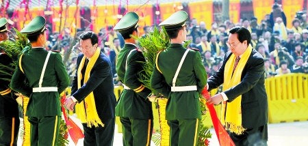 3月29日上午,省委書記、省人大常委會(huì)主任徐光春,省委副書記、省長(zhǎng)郭庚茂在己丑年黃帝故里拜祖大典儀式上向黃帝像敬獻(xiàn)花籃。記者 陳 偉 攝