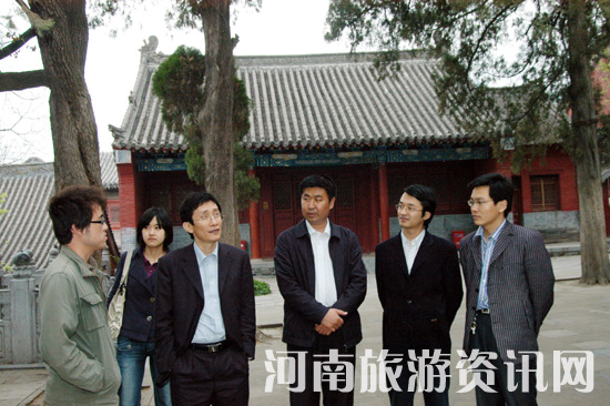倪鵬飛一行在少林寺景區(qū)內(nèi)考察,省旅游局副局長宋爭輝陪同考察。