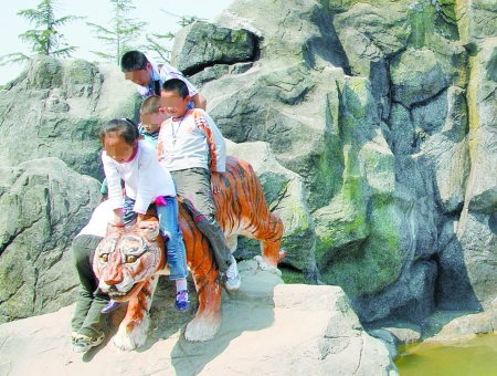 在吉林園內(nèi)的長白山下,有一個老虎下山雕像,不少家長把小孩抱到老虎身上合影留念(如圖),最多時一只老虎身上騎了4個小孩。在青海省展園,設(shè)置有三只白色綿羊雕像,其中最大個的綿羊最受傷,其右耳不知何時竟被游客折斷了。