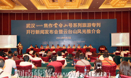 8月3日,武漢至焦作云臺山號系列旅游專列開行新聞發(fā)布會暨云臺山風(fēng)光推介會在武漢舉行。河南省旅游局局長范修芳,湖北省旅游局局長張達華、副局長陸令壽,焦作市委常委、副市長趙建軍,焦作市政府黨組成員、市長助理魏豐收,武漢市旅游局副局長徐緒群,武漢鐵路局客運處處長戴江南,鄭州鐵路局客運處副處長柴玉忠,焦作市旅游局局長趙衛(wèi)星,修武縣委書記遲軍,修武縣委副書記、代縣長劉曉波等出席發(fā)布會。豫鄂兩省近40家新聞媒體和80余家旅行商應(yīng)邀參加發(fā)布會。