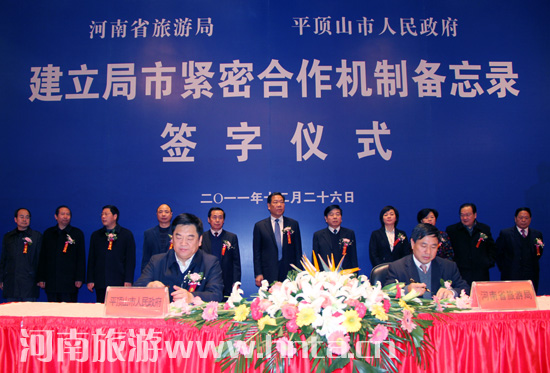 王玉寶副局長(zhǎng)宣讀了《關(guān)于建立局市緊密合作機(jī)制備忘錄》內(nèi)容,范修芳局長(zhǎng)與陳建生市長(zhǎng)分別代表局市簽署了合作協(xié)議!秱渫洝芳s定成立局市緊密合作機(jī)制組織機(jī)構(gòu)。省旅游局將從六個(gè)方面支持平頂山市旅游業(yè)發(fā)展:一是支持平頂山市建設(shè)海內(nèi)外知名旅游目的地。二是支持落實(shí)《平頂山市旅游目的地發(fā)展總體規(guī)劃》。三是支持平頂山市旅游業(yè)發(fā)展創(chuàng)新。四是支持平頂山市打造海內(nèi)外一流精品景區(qū)。五是支持平頂山市推進(jìn)鄉(xiāng)村旅游發(fā)展。六是支持平頂山市加快旅游人才隊(duì)伍建設(shè)。平頂山市將從八個(gè)方面加快旅游業(yè)發(fā)展。一是加快旅游產(chǎn)業(yè)轉(zhuǎn)型升級(jí)。二是在中原經(jīng)濟(jì)區(qū)建設(shè)中發(fā)揮支柱作用。三是促進(jìn)景區(qū)產(chǎn)品提質(zhì)升級(jí)。四是提高整體營(yíng)銷水平。五是加快旅游公共服務(wù)設(shè)施建設(shè)。六是加強(qiáng)旅游人才建設(shè)。七是加快高智能數(shù)字化旅游目的地建設(shè)。八是加大資金支持力度。