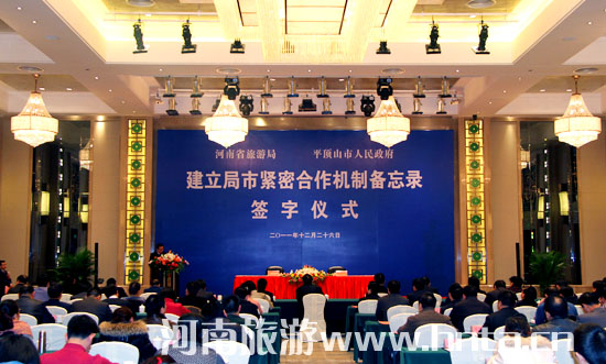 12月26日,河南省旅游局與平頂山市人民政府局市緊密合作機(jī)制備忘錄簽字儀式在平頂山新城區(qū)舉行。省旅游局局長(zhǎng)范修芳、副局長(zhǎng)王玉寶,平頂山市委書記趙頃霖、市政府市長(zhǎng)陳建生、市委秘書長(zhǎng)張遂興、市政府常務(wù)副市長(zhǎng)王麗、市政府副市長(zhǎng)鄭茂杰,省旅游局部分處室負(fù)責(zé)人,平頂山市直有關(guān)單位、各縣(市、區(qū))分管旅游工作的副縣(市、區(qū))長(zhǎng)和旅游局長(zhǎng)、部分旅游企業(yè)負(fù)責(zé)人等參加簽字儀式。