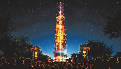 玲瓏寶塔,流光溢彩。春天來了,雨絲飄飄,春芽萌發(fā),接著是夏景、秋景、冬景,四季在鐵塔上輪回,時(shí)光在塔身上流轉(zhuǎn)。變幻的光影中,天龍八部各放異彩,祥鳥瑞獸穿云而來,天花亂墜,步步生蓮。寶藍(lán)色的天幕下,鐵塔燃燈,照徹天地。夜空里,佛光,蓮花,鐘聲,梵音,如水如煙,浸泡著我們,擁裹著我們,宇宙空靈,心凈如洗……