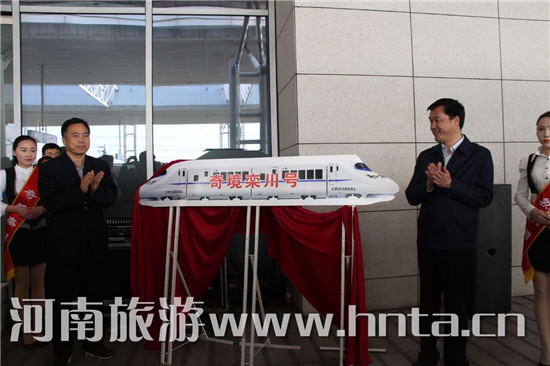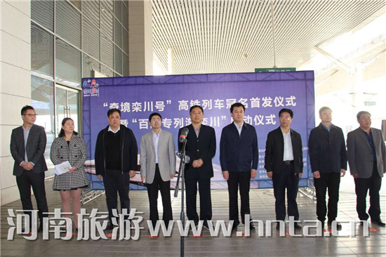 由洛陽市旅游發(fā)展委員會、欒川縣人民政府主辦的“奇境欒川號”高鐵列車冠名首發(fā)儀式暨“百趟專列游欒川”啟動儀式同期舉行。河南省旅游局領(lǐng)導(dǎo)倪豫州,洛陽市政府副市長魏險峰等領(lǐng)導(dǎo)出席啟動儀式。據(jù)悉,“奇境欒川”號高鐵列車為京西線高鐵,每日往返于北京和西安。該列車共16節(jié)車廂,行程覆蓋了京、冀、豫、陜四省市15個大中城市。