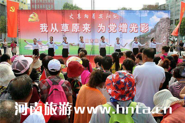 7月1日上午,安陽(yáng)市火車站廣場(chǎng)成了紅色的海洋,一列從內(nèi)蒙古飛馳而來的旅游專列到達(dá)了這里。伴隨著《草原上升起不落的太陽(yáng)》等歌曲,安陽(yáng)市旅游局工作人員和導(dǎo)游們?cè)诨疖囌緩V場(chǎng)載歌載舞,迎接安陽(yáng)市草原第一列旅游專列的客人。游客們則帶著草原的祝福,揮舞著五星紅旗和黨旗走進(jìn)安陽(yáng),與安陽(yáng)人民共慶建黨95周年。一首《今天是您的生日》引起了在場(chǎng)的大合唱,更是將活動(dòng)帶入了高潮。