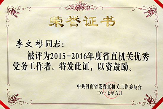 河南省旅游局在2015-2016年度省直機關表彰中喜獲佳績