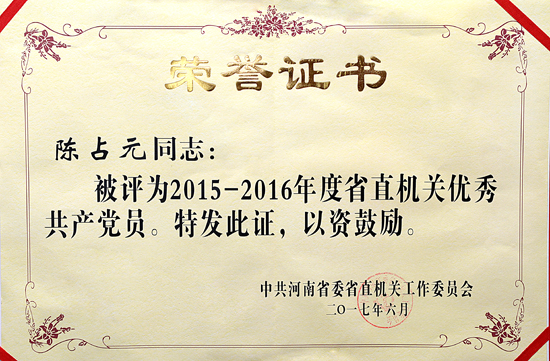 為弘揚正氣、樹立標桿,激勵省直機關各級黨組織和廣大共產(chǎn)黨員堅定信念、對黨忠誠、履職盡責、奮發(fā)作為,在紀念建黨96周年之際,河南省省直工委下發(fā)了《關于表彰省直機關2015-2016年度優(yōu)秀共產(chǎn)黨員、優(yōu)秀黨務工作者和“五好”基層黨組織的決定》(豫直文[2017]35號),對省直機關部分優(yōu)秀共產(chǎn)黨員、優(yōu)秀黨務工作者、先進基層黨組織予以表彰。其中,我局機關黨委榮獲“五好”機關黨委稱號,辦公室黨支部榮獲“五好”黨支部稱號,李文彬榮獲“優(yōu)秀黨務工作者”稱號,陳占元榮獲“優(yōu)秀共產(chǎn)黨員”稱號。