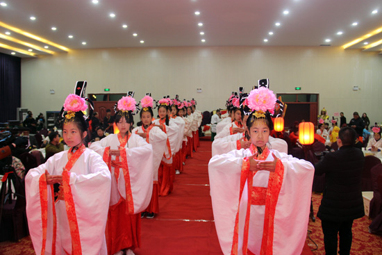 穿漢服彰顯民族特色、行古禮傳承華夏文明。營員和領隊老師全體參與,身著不同造型的古裝、親身體驗了一場體現(xiàn)漢傳統(tǒng)文化精粹之一的中式婚禮。伴隨著磅礴大氣的中華禮樂,浩浩蕩蕩的迎親儀仗隊、龍鳳長號手、開道將軍、喜牌官、小福星、新貴人、喜嫁娘等按照中華傳統(tǒng)禮儀拜天地、行三揖三讓禮、沃盥禮、執(zhí)手禮等古禮。營員們興致盎然、全身心的投入到自己的角色當中,身臨其境的感受古典純樸的中華禮樂文明。