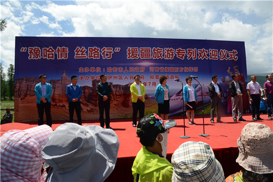哈密市委副書記、市長祖木熱提·吾布力在致辭中說:“豫哈情·絲路行”援疆旅游專列搭起了中華文化重要發(fā)源地與瓜鄉(xiāng)哈密的橋梁,開啟了豫哈旅游合作發(fā)展的新模式。我們真誠地希望瓜鄉(xiāng)哈密能給大家留下甜蜜的記憶,希望大家未來生活得更甜蜜。