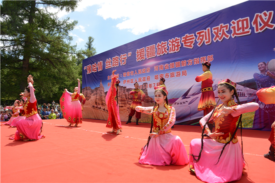 親戚越走越近,感情也越來越深!7月2日上午,滿載著950多名中原游客的“豫哈援疆號(hào)”旅游專列抵達(dá)新疆哈密。哈密市在美麗的東天山風(fēng)景區(qū)舉行了盛大的歡迎儀式。悠揚(yáng)的木卡姆響起來,美麗的新疆舞跳起來,甜蜜的哈密瓜端上來,讓河南游客剛一落地,便體驗(yàn)到了不一樣的新疆風(fēng)情。