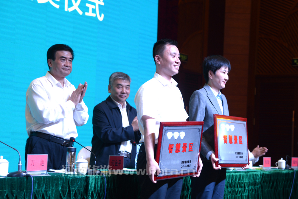 河南省政府副省長何金平、文化和旅游部信息中心副主任信宏業(yè)為“三鉆級智慧景區(qū)”頒發(fā)獎牌