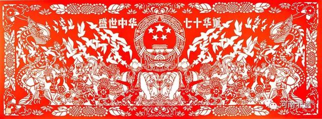 此次展出作品中,有一副必須要重點推介——長8米,高2.2米的《開國大典》剪紙。該作品為我省近年來少見的巨幅剪紙作品,畫面以1949年10月1日的天安門為主題,定格毛澤東宣布“中國人民從此站起來了”的偉大時刻,刻畫了60多位歷史人物的生動形象。