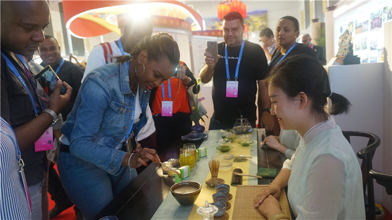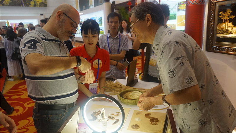 展廳的各個展臺還擺放著距今400多年的秦氏絹藝、生動逼真的鎮(zhèn)平玉雕、造型各異的鈞瓷花瓶、歷史感濃厚的青銅器復制品。新鄉(xiāng)面塑、做工繁雜的絞胎瓷、清化竹編、洛寧竹編、劉騰龍毛筆……博大的河南文化,吸引世界各國嘉賓目光。