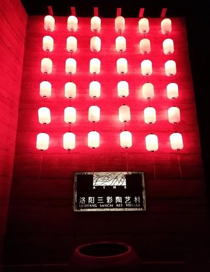 紅色燈籠亮起,映照在老民房與新打的夯土墻組成的“洛陽三彩”展覽館上。三彩釉畫拼成的《八方門神》流光溢彩,上千只陶碗緊密排列而成了壁畫《宙》,神秘圖案“河圖洛書”隱于三彩環(huán)藝《河洛》之中。