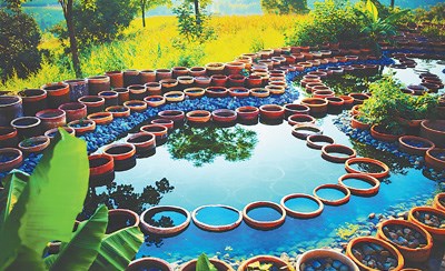 在這里,缸是花盆、護桿、沿路的垃圾桶,也是指路牌、警示牌。缸,還是“陶寶創(chuàng)意店”里的展臺、會議室里的幾案。山谷間綿延的步道,也由大陶缸擺放、切割、填充而鋪成,名曰缸圈路。