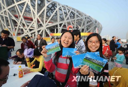 9月29日,游客在“鳥巢”外的臨時(shí)郵局寄明信片。 新華社記者 李文/攝