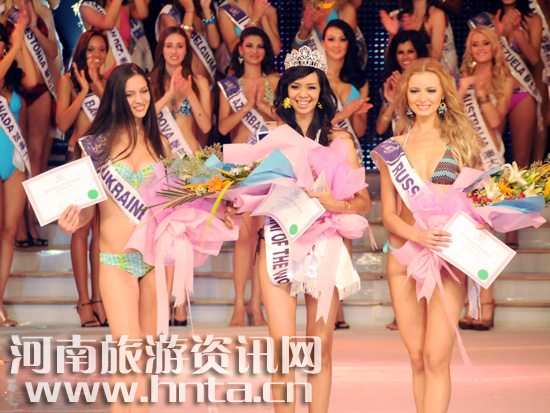 8月17日晚上8:00,2009國際旅游小姐冠軍總決賽世界比基尼小姐單項賽在信陽平橋區(qū)會展中心舉行,經(jīng)過兩個小時的激烈角逐,來自巴厘島的Yoke Paramita DJATI WALUJO、俄羅斯的Ekaterina GRUSHANINA、烏克蘭的Ruslana STARODUB分別獲得冠、亞、季軍。河南省旅游局副局長、活動副指揮長倪豫州為獲獎選手頒獎。