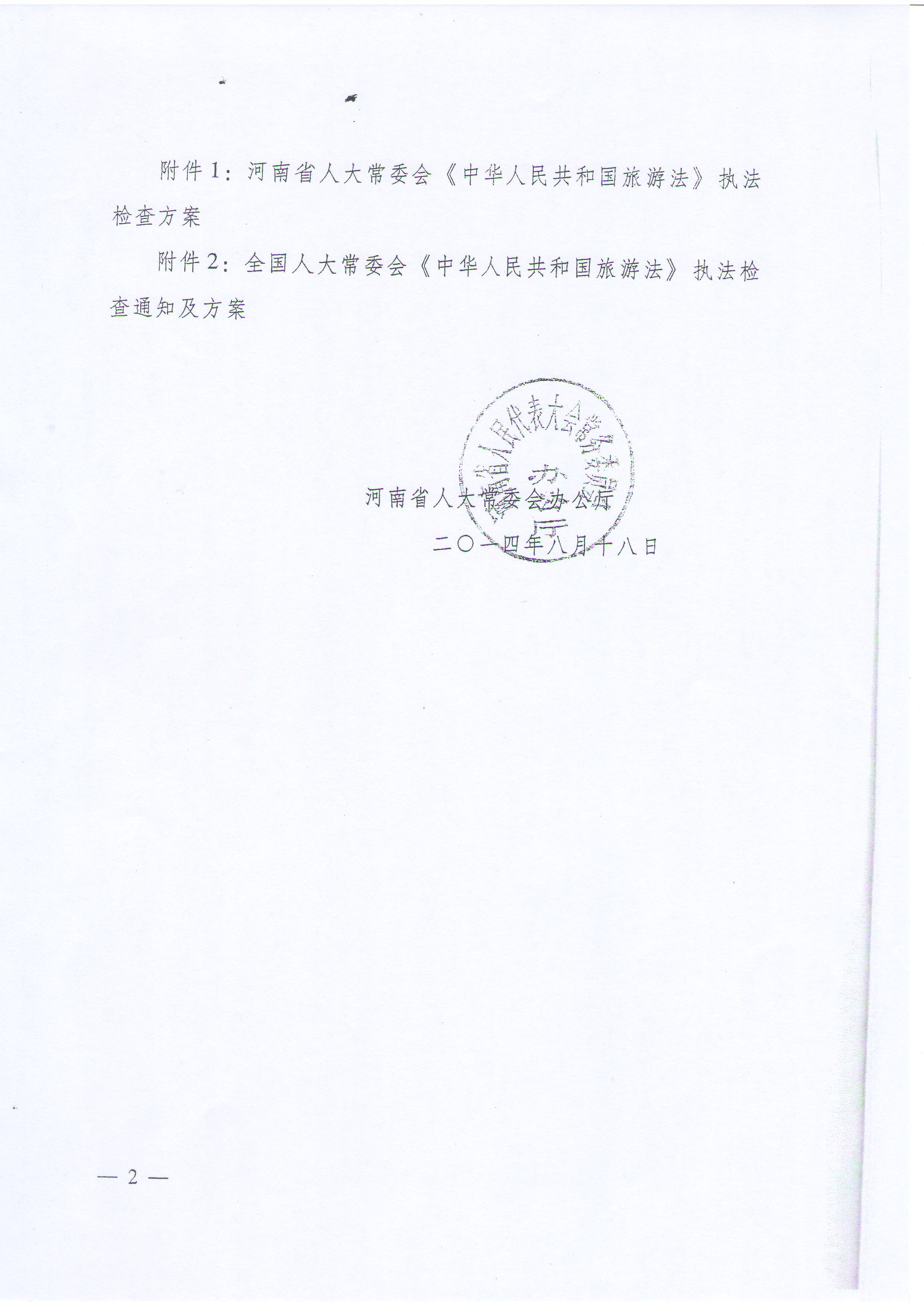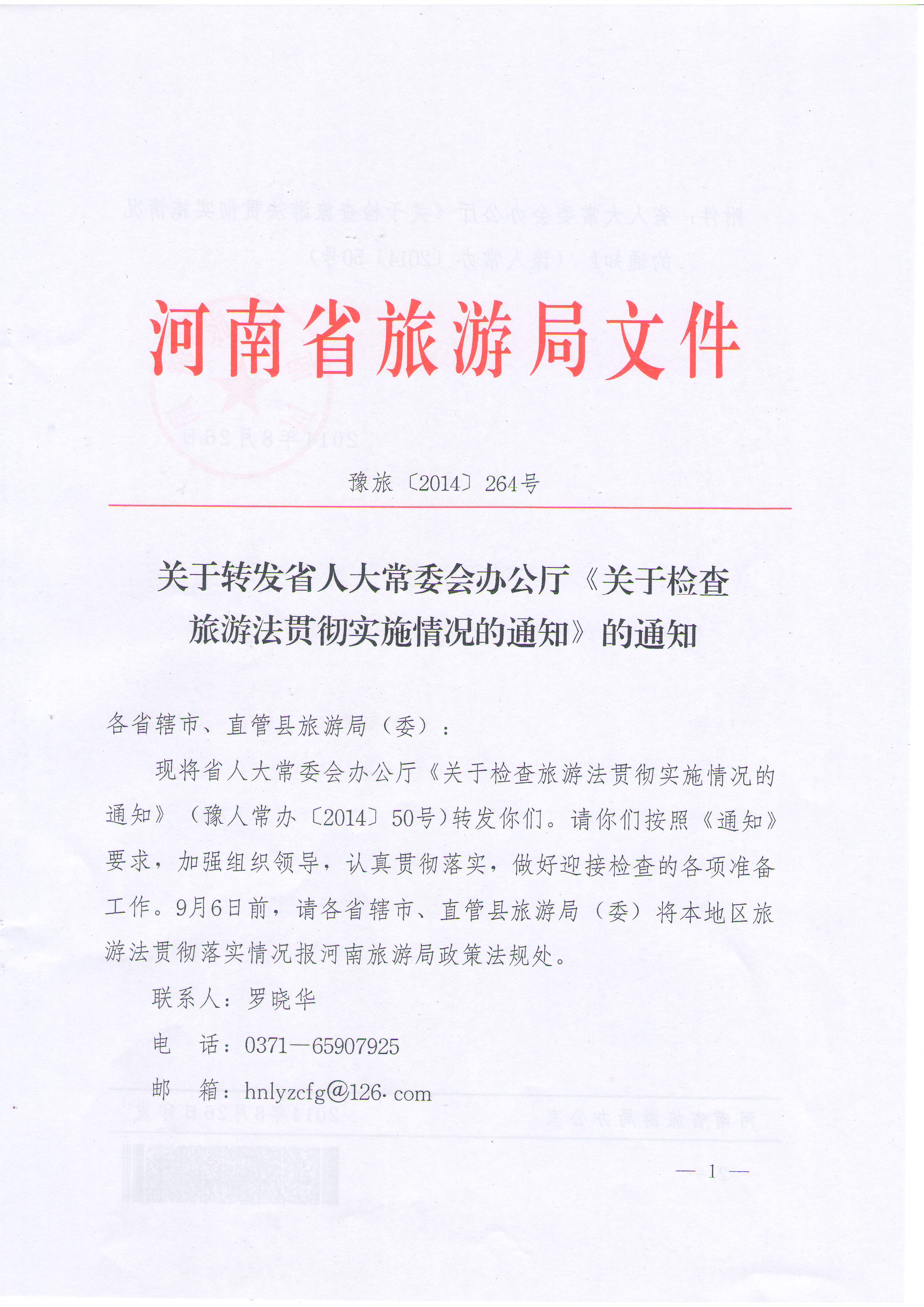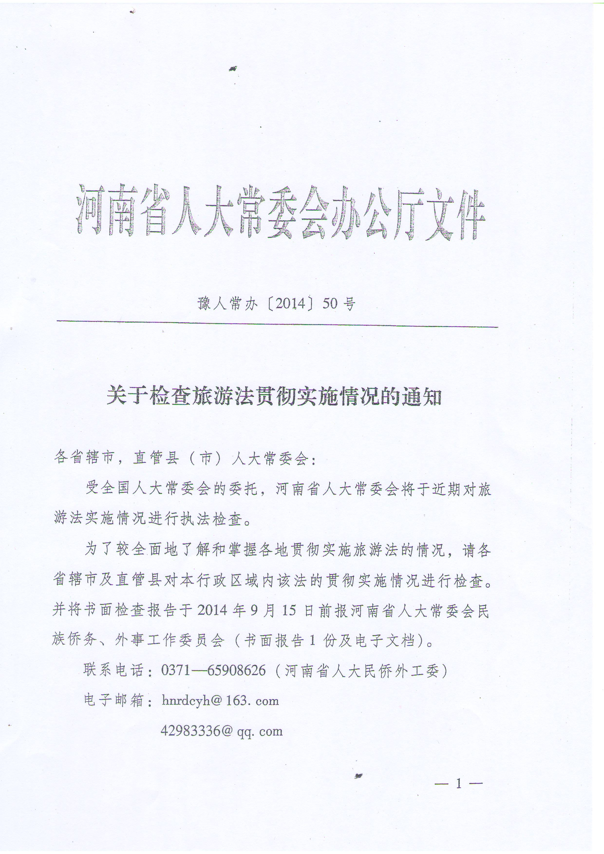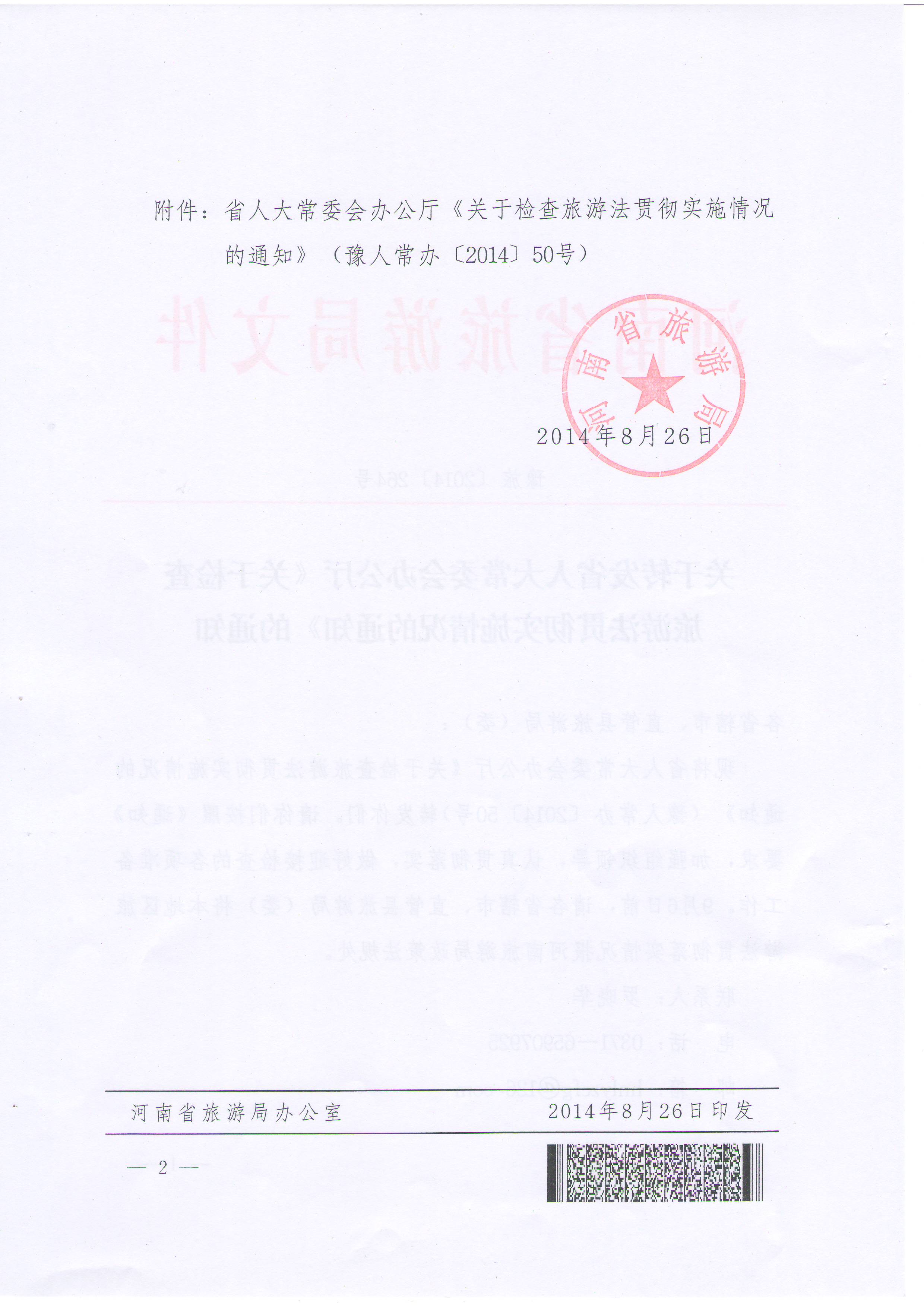 附件:省人大常委會辦公廳《關(guān)于檢查旅游法貫徹實(shí)施情況的通知》(豫人常辦〔2014〕50號)