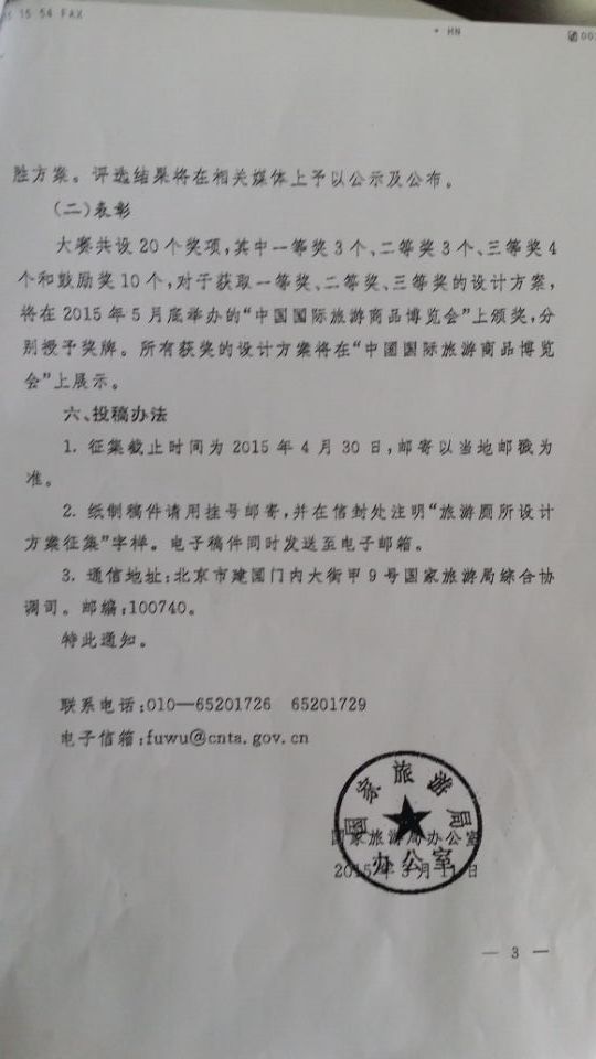 三、征集截止時間為2015年4月30日,各參賽單位及個人請在規(guī)定的時間內(nèi)完成作品的設(shè)計,并以書面及電子版形式報送至國家旅游局指定的郵箱及地址,同時將作品的紙質(zhì)版(一份)郵寄至省旅游局規(guī)劃發(fā)展處用于備案。