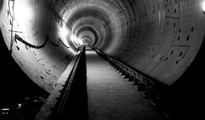 順著鐵軌往東走不遠(yuǎn),就看到兩個(gè)深邃的隧道,隧道里亮著施工用的照明燈,鐵軌延伸到隧道深處,顯得神秘幽深。