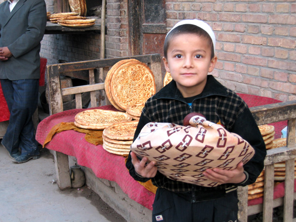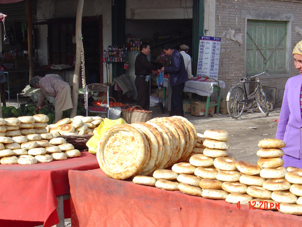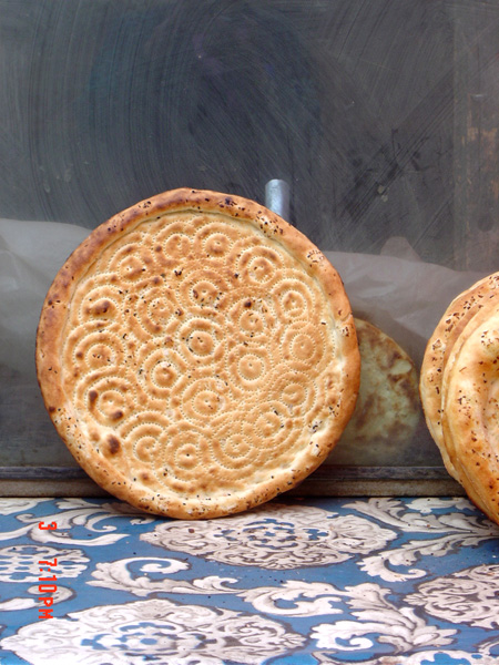 馕這個(gè)東東,在去新疆之前并非沒有見識(shí)過。剛來北京還騎自行車上下班的時(shí)候,每天總要穿行魏公村的新疆村,路邊的幾間鋪?zhàn),大鐵爐上經(jīng)常整齊排列著一堆金黃的面餅,盤子大小,也有臉盆那么大的,黃燦燦的樣子似乎很誘人。但不是愛吃面食的人,從未想到要嘗一嘗。