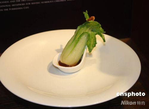 圖為“國(guó)寶宴”第一道菜“翠玉白菜”,選用產(chǎn)自臺(tái)灣中部的娃娃菜,整棵菜剝掉百分之九十,只取小小的菜心、長(zhǎng)約八到十公分大小。先經(jīng)過(guò)火腿、雞高湯汆燙入味,之后可以淋上XO高湯醬汁熱食,或搭配咸甜的芝麻醬汁當(dāng)開(kāi)胃冷食。珍寶原件的翡翠白菜上有蟈蟈,主廚就在迷你白菜上放一只櫻花蝦替代,食趣十足。