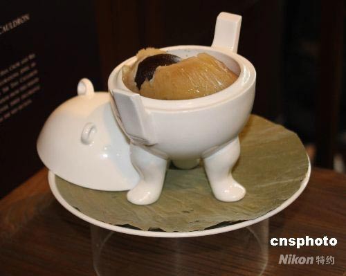 圖為戰(zhàn)國(guó)時(shí)代青銅器的代表作“弦紋鼎”,被仿制成白瓷容器,盛裝閩菜之首“佛跳墻”。