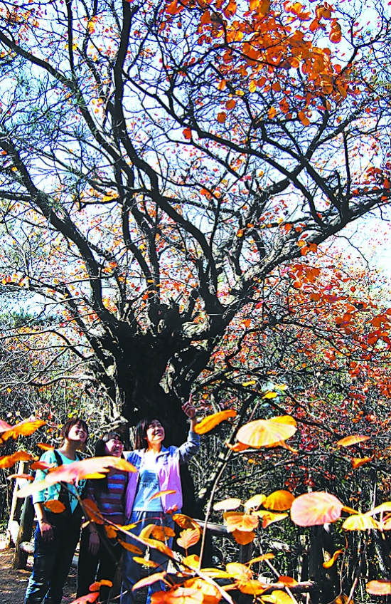圖為安徽省的游客在靳家?guī)X觀賞千年黃櫨樹