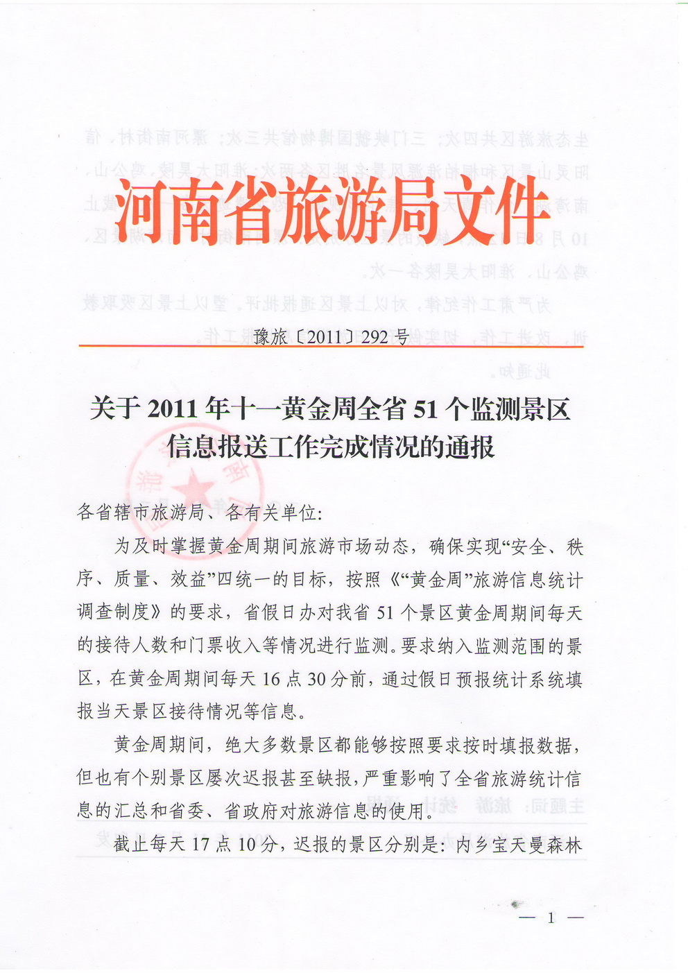 - 關(guān)于2011年十一黃金周全省51個監(jiān)測景區(qū)信息報送工作完成情況的通 2011-11-2 18:03:14