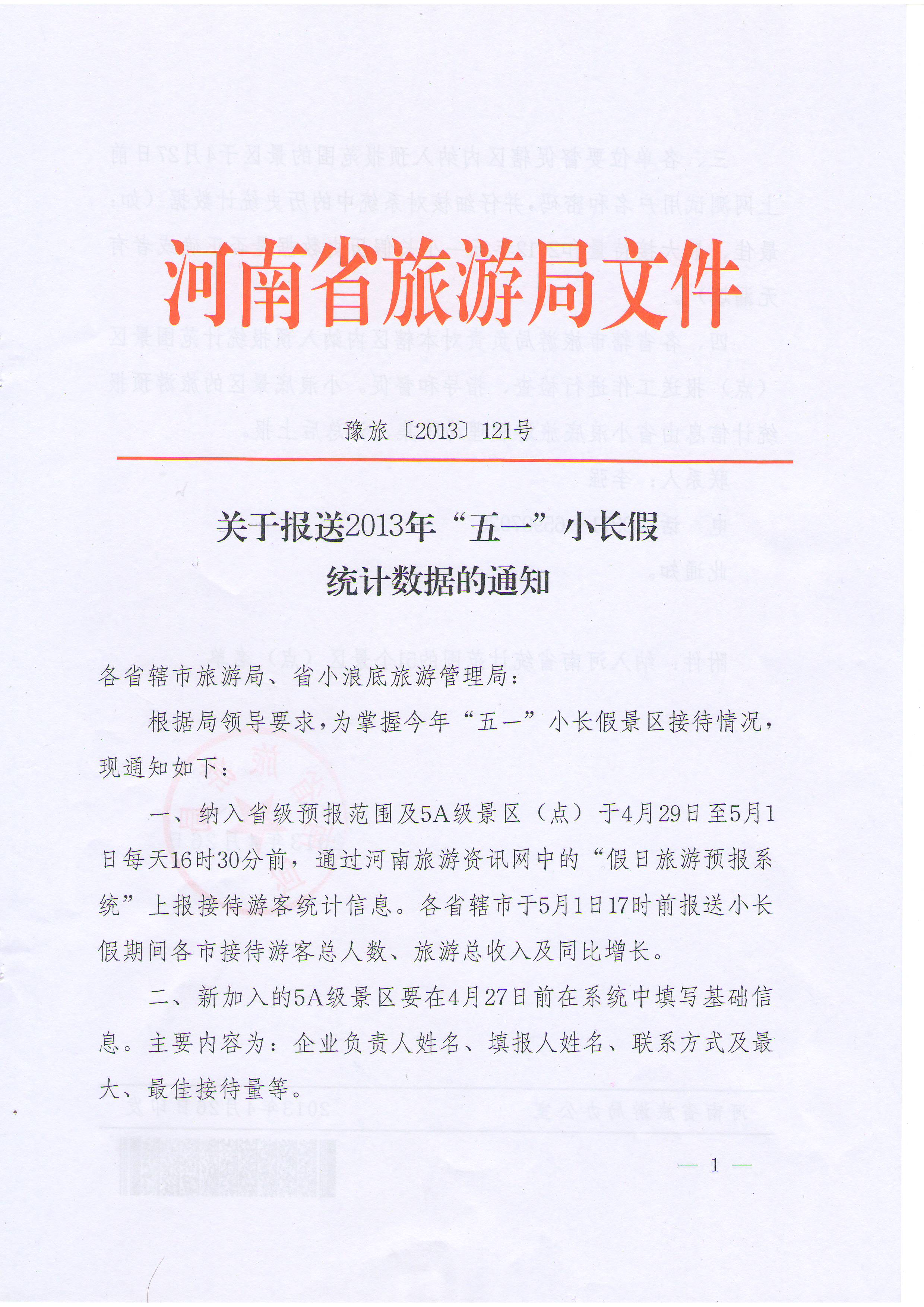 關(guān)于報送2013年“五一”小長假統(tǒng)計數(shù)據(jù)的通知