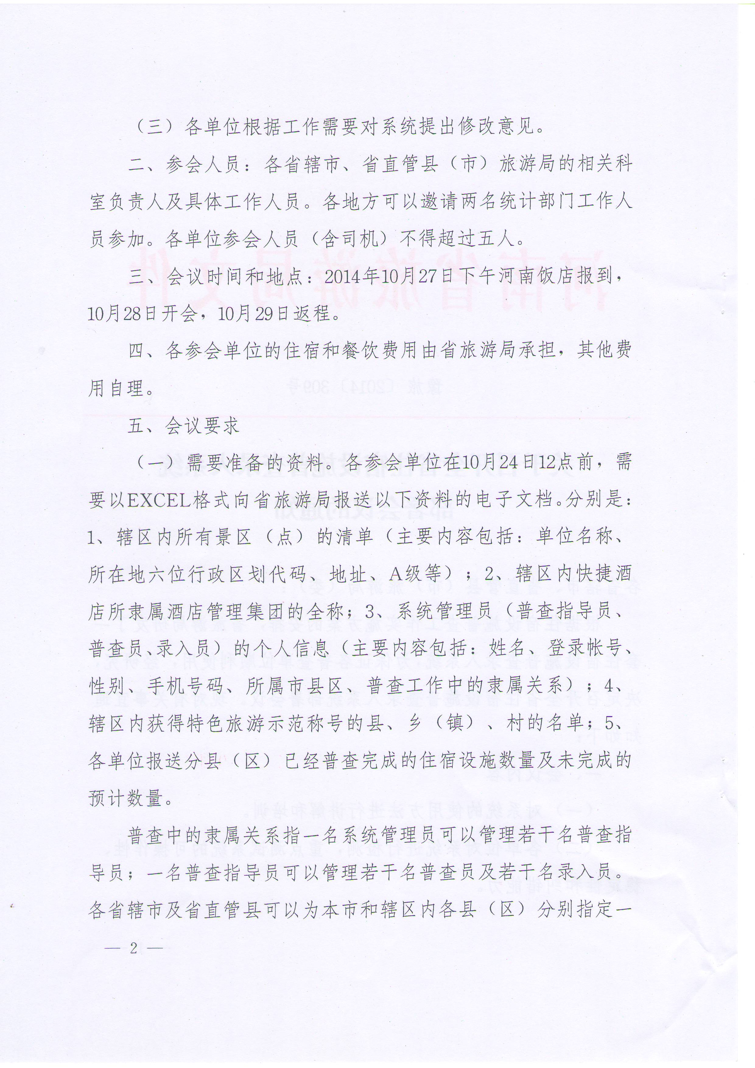 二、參會人員:各省轄市、省直管縣(市)旅游局的相關(guān)科室負(fù)責(zé)人及具體工作人員。各地方可以邀請兩名統(tǒng)計部門工作人員參加。各單位參會人員(含司機)不得超過五人。