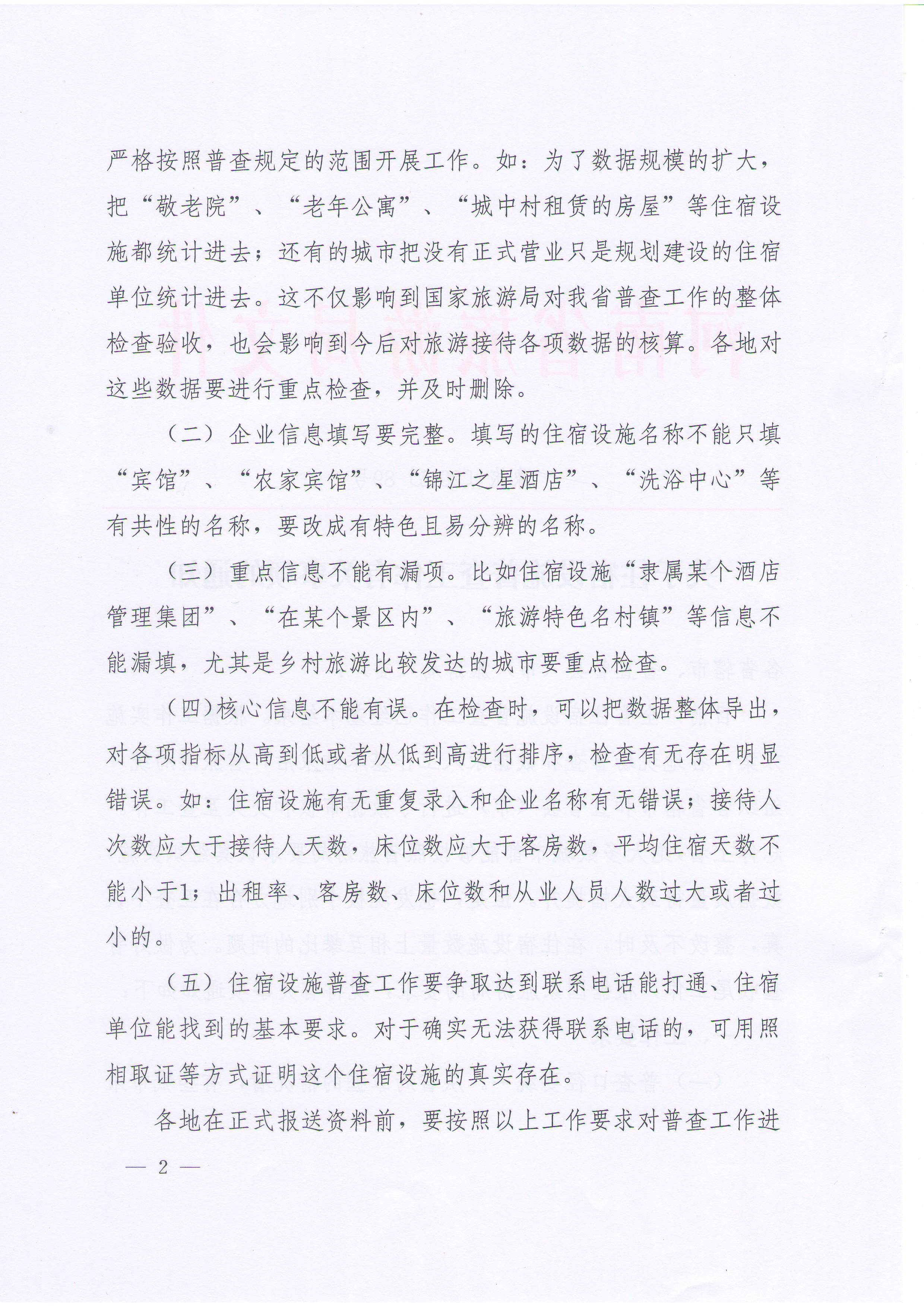 (一)普查口徑要統(tǒng)一。從省局掌握的情況看,有些城市未嚴(yán)格按照普查規(guī)定的范圍開展工作。如:為了數(shù)據(jù)規(guī)模的擴大,把“敬老院”、“老年公寓”、“城中村租賃的房屋”等住宿設(shè)施都統(tǒng)計進(jìn)去;還有的城市把沒有正式營業(yè)只是規(guī)劃建設(shè)的住宿單位統(tǒng)計進(jìn)去。這不僅影響到國家旅游局對我省普查工作的整體檢查驗收,也會影響到今后對旅游接待各項數(shù)據(jù)的核算。各地對這些數(shù)據(jù)要進(jìn)行重點檢查,并及時刪除。